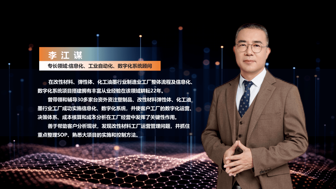 广东安拓普聚合物科技有限公司研发总监李同兵博士从与顺景合作以来安拓普聚合物实施数字化改造以来的变化及自己的感悟对安拓普数字化工厂的核心优势概括为物流、信息流、财务流三流合一,生产及物资状态实时监控,研发成果与生产状态实时关联,人员与财务成本核算实时更新,客户可实时对产品质量进行追溯。安拓普通过对生产车间现状和生产流程进行了全面的数字化升级后,通过数据的收集和分析,实现了生产过程的实时和优化,大幅提高了产品质量和生产效率。